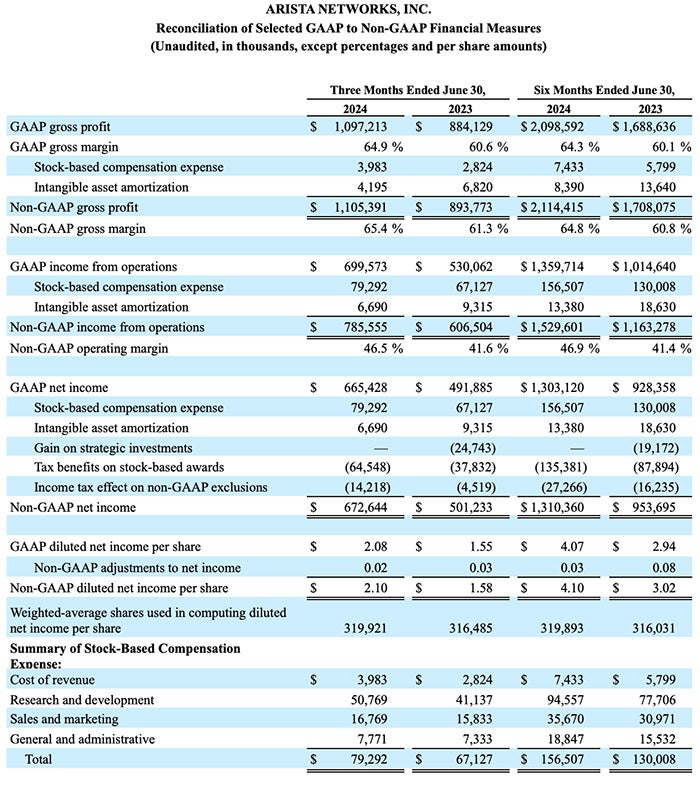 “On the heels of our June celebration of 10 years as a public company, I would again like to thank our customers, employees and partners for contributing to our success as we arrived at this important milestone,” said Jayshree Ullal, Chairperson and CEO of Arista Networks. “Our Q2 2024 financial results demonstrate Arista's powerful combination of growth, profitability and best of breed platforms.”